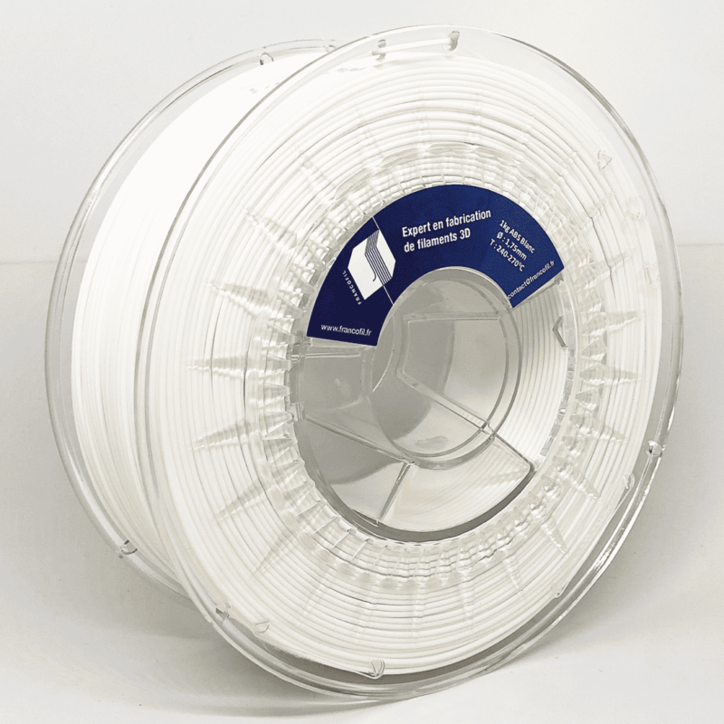 L’ ABS blanc FRANCOFIL (acrylonitrile butadiène styrène) est un plastique très utilisé dans l’industrie automobile ou la fabrication de pièces plastique en général. Ce polymère amorphe est un plastique pétrochimique reconnu pour sa résistance aux chocs et à la chaleur. L’impression 3D de ce consommable ABS blanc Francofil nécessite un plateau chauffant (90°C) et une chambre d’impression close. Durant l’impression l’ ABS peut dégager une légère odeur, il est recommandé l’utilisation d’un filtre à particules.